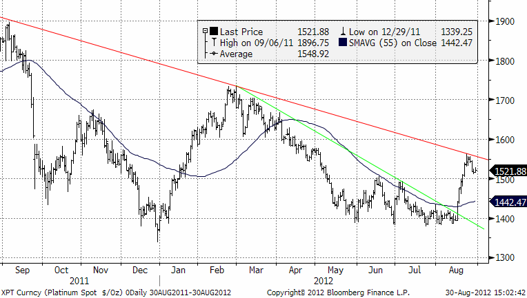 Ur teknisk synvinkel kan man konstatera följande. Resan ner 2008 är mycket hårdare än rörelsen tillbaka upp ‐ det är negativt, men då vi i ett något mindre långsiktigt perspektiv kan se att uppgången Jan‐Mar i år har tagit ut toppen från Nov förra året. Då lutar analysen åt ett brott uppåt. Tyvärr får vi ingen riktigt bra teknisk bekräftelse att detta är rätt spår förrän marknaden tar ut årshögsta vid 1732. Om marknaden faller ner under 1374, är risken hög att också årslägsta kommer att passeras på väg nedåt. Man kan handla detta genom att försöka köpa platina och ha en stopp‐loss under 1787.