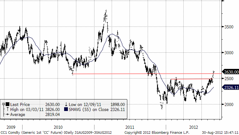 Vi skrev förra veckan att vi skulle vilja vara långa kakao om nivån 2500 dollar bröts. Den bröts i veckan och vi är därför långa KAKAO S. Västafrika har drabbats av torka. De kommande 30 dagarnas väder blir avgörande för skörden i Elfenbenskusten, som tävlar med Ghana om att vara världens största producenter.