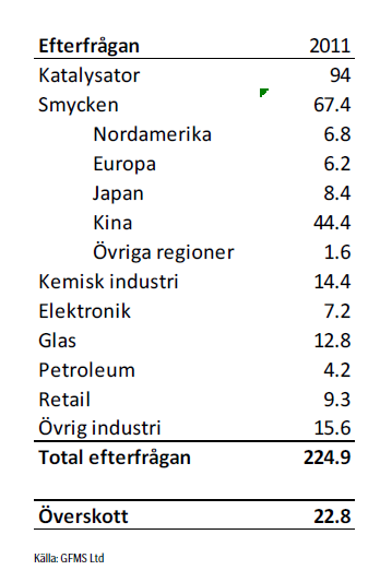 Efterfrågan är huvudsakligen till katalysatorer. Smyckesefterfrågan är också stor – och växande. Platina blandas med guld för att tillverka vitguld. Vi ser nedan att kineser föredrar vitt guld framför rött. 44.4 ton går direkt till Kina. I takt med att Kinas befolkning får det bättre, ökar därför efterfrågan på platina. Efterfrågan har generellt sett ökat de senaste åren. År 2007 låg den på 27.3 ton, 2008 på 28.3, 2009 på 59.8 och 2010 låg den på 36.7 ton.