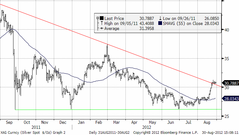 Silver ser ut att ha etablerat en botten på 26 dollar och ser ut att konsolidera sig inför en eventuell förestående prisuppgång. Om / när trendlinjen i diagrammet nedan bryts signalerar det att nedåttrenden är bruten . Nästa motstånd är 30 dollar. När den bryts erhålls en köpsignal. Vi tycker att man ska undvika att vara kort silver, utan istället försöka komma in på den långa sidan, men man ska inte göra det förrän trendlinjen bryts! Ibland händer det, ganska ofta faktiskt, att trendlinjen håller. Den senaste veckans kursrörelser har varit så kraftlös att det är lite för hög risk att äga silver på kort sikt. Vi tycker att man ska kliva ur eventuella långa positioner och vänta och se vad som händer.