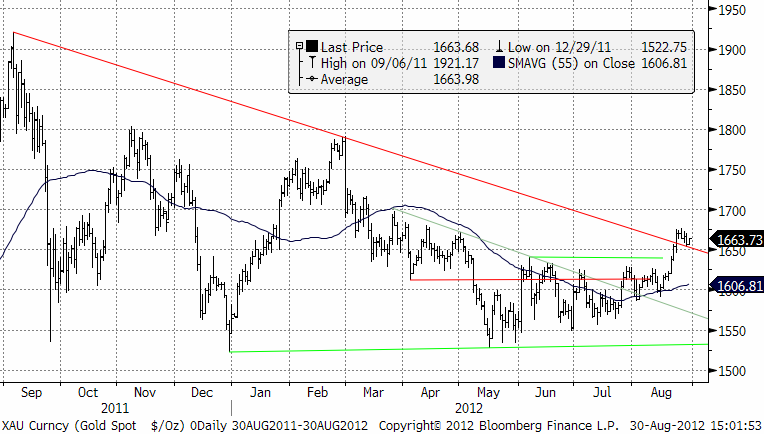 Det nyliga brottet, både över en tänkt medelsiktig fallande motståndslinje och över det återigen stigande glidande 233‐dagars bandet (som vanligt baserat på dagliga lägsta,‐ stängnings, ‐ och högsta noteringar) konsolideras just nu då de som redan var långa tar vinst och de som ännu inte är det bygger långa positioner. Med starkt stöd i $1665/1640 området så bör det inte dröja förrän nästa impuls högre tar vid – då med nivåer över $1700 i sikte för den kortsiktige aktören.