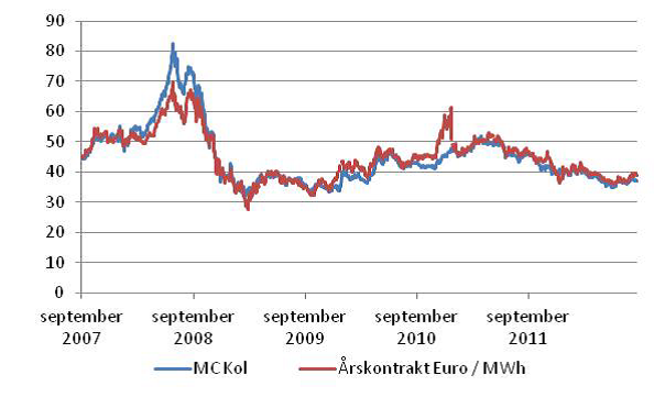 Vi väntar oss oförändrade till sjunkande pris på kol under de kommande två månaderna. Den kinesiska ekonomin håller på att svalna. Kostnaden för att producera elektricitet med kol i Tyskland betyder faktiskt allt för det långsiktiga priset på el i Norden. Nedan ser vi marginalkostnaden för kolkraft i Tyskland och priset på det närmaste årskontraktet. Vi ser att priset i Norden helt och hållet bestäms av priset för utsläppsrätter och bituminöst kol.