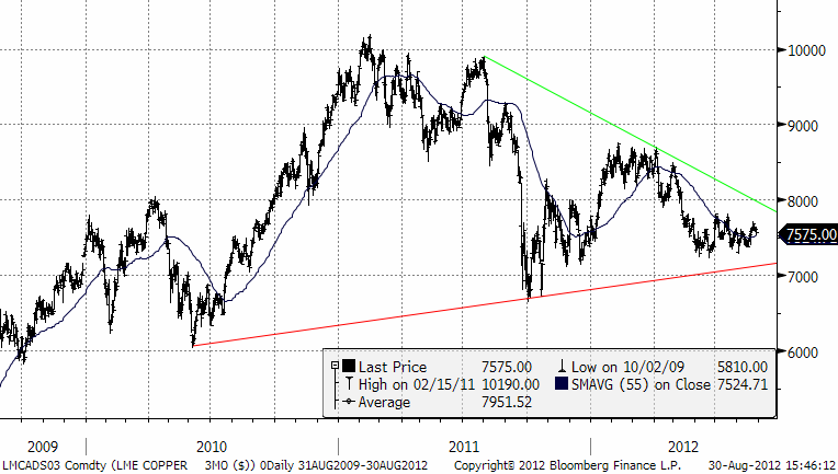 Efter långhelgen i London återupptogs handeln på LME med svagt sjunkande priser. Fredagens (imorgon) årliga tal av den amerikanska centralbankschefen i Jackson Hole, emotses med spänning. Marknaden väntar sig (och hoppas på) indikationer på en snar stimulansåtgärd från FED. Priserna på basmetaller har handlats sidledes, dock med relativt stora rörelser. Vi bedömde att förra veckans starka utveckling förmodligen kom lite för tidigt. Det behövs faktiska stimulanser (och inte bara prat om) och fler indikationer på att Kina klarar av att mjuklanda ekonomin. Som vi befarade orkade inte kopparpriset bryta igenom motståndsnivån $7720 och i takt med skiftande fokus mot inköpsindex i Kina, och inför långhelgen, föll priserna tillbaka. Innevarande vecka har karaktäriserats av avvaktan inför fredagens tal från Bernanke. Det känns ändå som marknaden strävar mer mot uppsidan. Få aktörer vågar spekulera i en prisnedgång.