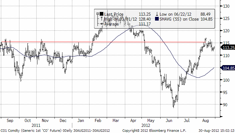 Uppgången in i motståndsområdet verkar ha kommit av sig, dock noteras även stöd i ett glidande 233‐dagars genomsnittsband ($113.30 / 110.00), men skulle utbudet vara så stort att efterfrågan i detta området mättas så räknar vi med fall ner in i ett bredare ~$108 / 101 område. Nya toppar krävs nu för att minska den kortsiktiga nedåtrisken.