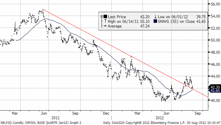 För september och oktober har vi en fortsatt negativ vy till elpriset för kvartalskontraktet som avser det första kvartalet 2013. Spotpriserna kommer troligtvis att vara nedtryckta på grund av de välfyllda vattenmagasinen. Makroekonomin får också säkerligen motvind efter att den amerikanska kongressen återsamlas igen efter sommaruppehållet, den europeiska tillväxten fortsätter att hacka och den kinesiska ekonomin svalnar allt mer. Bränslepriser kommer troligtvis också att röra sig sidledes eller nedåt under de kommande två månaderna. Det närmaste kvartalskontraktet kommer troligtvis att notera nya bottennivåer i september och oktober. Varefter vi närmar oss vintern, kommer det att finnas hausse‐dagar, då väderleksrapporterna åtminstone tillfälligt alltid visar torrt och kallt väder. Eller så har kärnkraftverken i Sverige tekniska problem. När det första kvartalskontraktet för 2013 återigen går under €40/MWh, borde det vara köptillfälle för att dra nytta av vinterns prisuppgångar.