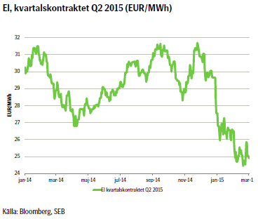 Det är svårt att med nuvarande fundamentala situation se att vi varaktigt ska bryta vad som snarast är ett dödläge vad gäller prisutvecklingen på el. Trots att priset rör sig inom ett väl definierat intervall bjöd dock förra veckan på ett imponerande rally som så småningom reverserades till dito baisse. I skrivande stund handlas Q215-terminen strax över 25 euro per MWh, vilket är i den nedre delen av det intervall som kontraktet har rört sig i sedan årsskiftet. Vi tror att botten sannolikt är nådd i den längre nedåtgående trenden, även om det säkert kommer att fortsatt finnas ett visst nedåttryck.