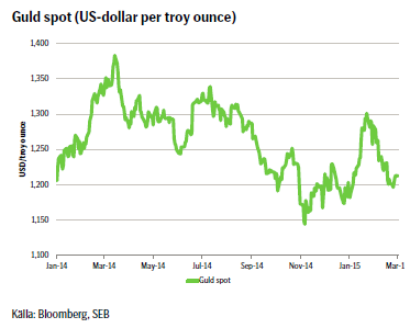 Förra veckan valde vi att gå ur vår kortposition i guld vilket visade sig vara ett klokt beslut. Trots ett starkare dollarindex steg guldpriset i dollartermer cirka 1,6 procent. För kommande vecka ser vi inga tydliga signaler för ett högre guldpris. Förväntningarna att FED kommer att höja styrräntan i år stärktes då statistik visade att amerikansk inflation hamnade under nollstrecket för januari månad. Detta har inte skett sedan oktober 2009. Amerikanska konsumentpriser steg vilket också spädde på förväntningarna om en räntehöjning. En räntehöjning från den amerikanska centralbankens sida skulle innebära en ökad alternativkostnad för att hålla guld.