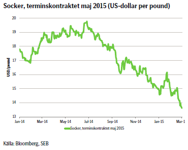 Priset på socker har under förra veckan fortsatt att falla kraftigt, vilket fick Maj15-kontraktet att bryta igenom 14 US cent och därmed notera en ny lägsta nivå. Säljtrycket verkar vara tekniskt baserat för att dra nytta av ett svagt momentum, där den ena försäljningen triggar den andra vartefter priserna sjunker. Fallet i den brasilianska valutan real har också varit en bidragande faktor liksom den senaste rapporten från International Sugar Organization (IS0) som visar att den globala produktionen av socker förväntas nå rekordhöga 172,1 miljoner ton under 2014/15 – detta trots prognoser om lägre skördar i flera ledande producentländer, däribland Brasilien, Kina och Thailand.