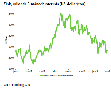 - Flera gruvstängningar i år och nästa, kommer inte fullt ut att ersättas. Risk för brist 2016 (zink).