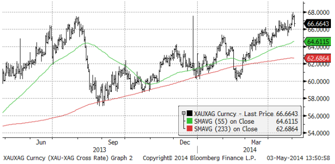 Nedan ser vi ett diagram över priset på guld uttryckt i silver. Det går alltså över 66 finuns silver på varje fin-uns av guld. Som vi ser är det en hög nivå, dvs silver är billigt i förhållande till guld.
