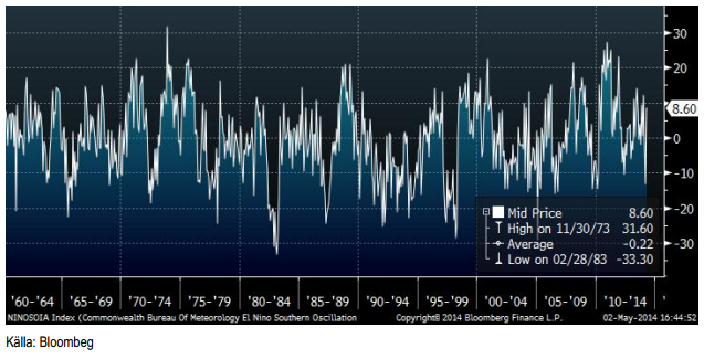 När allt fokus har varit på torkan i Brasilien har en ny fara för global kaffeproduktion dykt upp. El Niño väntas slå till i juli och enligt sex av sju klimatmodeller väntas den växa i styrka under hösten. På norra halvklotet börjar skörden av kaffe i september och oktober. El Niño skapar torka i länder som Australien, Indonesien och Vietnamn. De två senare är stora producenter av robusta-kaffe. Nedan ser vi hur Southern Oscillation Index har utvecklat sig sedan 1960. Ett SOI > 8.5 innebär La Niña och SOI < -8.5 innebär El Niño.
