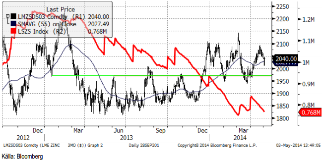 Zinkpriset har sedan kursrusningen under slutet av förra året, etablerat sig i ett prisintervall med det gamla taket som golv. Golvet finns vid ca 1975 dollar och taket vid 2100 dollar. Den långsiktiga trenden är dock uppåtriktad. Man gör bäst i att försöka köpa certifikat på zink nära golvet på prisintervallet, men generellt sett har vi köprekommendation.