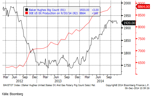 Det här är naturligtvis ett tecken på att Saudierna verkligen vill sälja så mycket olja de kan, för att via volym försöka hålla landets oljeintäkter uppe. Det är helt i linje med den spelteoretiska analys vi gjorde för ganska länge sedan, att skiffertekniken gör att OPEC som kartell upphör att fungera och oljeländerna går över till att agera såsom under fri konkurrens. Tidskriften The Economist nämnde samma analysmetod, spelteori i veckan som gick. Det centrala i den är inte att volymen från skiffertekniken behöver vara så värst stor, utan att den finns och är tillgänglig för ett stort antal länder.