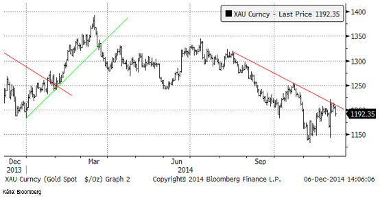 Guldpriset föll från det tekniska motståndet i fredags efter arbetsmarknadsstatstiken i USA publicerats. Den visade att amerikanska företag anställt 321,000 personer i November och det var ungefär 100,000 personer fler än vad marknaden hade förväntat sig. Det är den starkaste månaden på arbetsmarknaden sedan januari 2012.