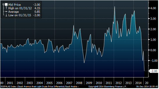 Saudi-ARAMCO har sänkt sitt pris för export till Asien och USA till den lägsta nivån sedan åtminstone år 2000. De säljer nu sin olja 2 dollar under benchmarkindexet. Så sent som vid årsskiftet såldes oljan för 3.50 dollar över benchmarkindexet. Priset är alltså till och med lägre än det var år 2008.