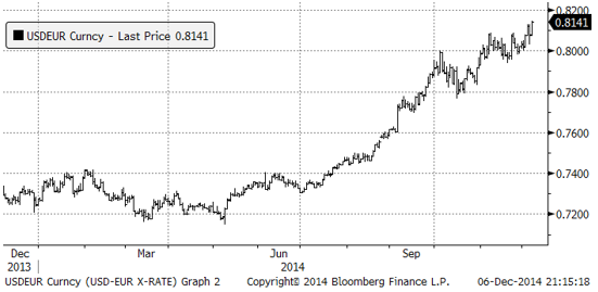 Detta fick dollarn att fortsätta stärkas mot andra valutor. I diagrammet nedan ser vi hur USDEUR (alltså priset på en dollar uttryckt i euro) förändrat sig det senaste året.