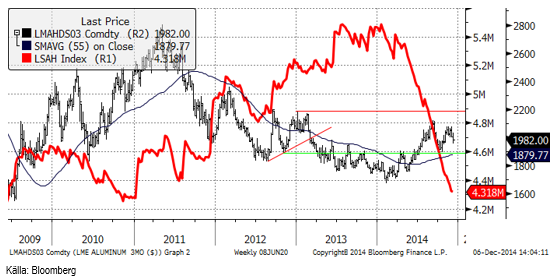 Skillnaden mellan cash och 3-månaders terminspris gick från 27 dollar i backwardation till under veckan. De längre terminerna handlas med contango, men mindre än normalt. Dec-14 till Dec-15 handlas t ex 20 dollar i contango mot 40-50 dollar för en månad sedan. Flödet mellan annullerade lagerbevis och nyskapade lagerbevis antyder att det sker något lite ”lending” i marknaden, enligt Metal Bulletin. Det verkar rimligt med tanke på att det är backwardation. Marknaden för fysisk metall (premierna) är lite svagare i Europa. Rotterdamnoteringen har kommit ner med 10 dollar till 420 dollar (över LME:s pris). Det officiella indexet för den amerikanska Mellanvästern håller sig fortfarande stabilt vid 520 dollar, men en del rapporter antyder att det skett stora affärer under den nivån. Om det är början på en minskning i premien är svårt att säga, men det kan vara början.