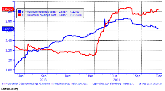 Nedanför ser vi hur mycket metall som finns i börshandlade fonder för platina respektive palladium. Investerare har fortsatt att sälja platina och köpa palladium den senaste veckan.