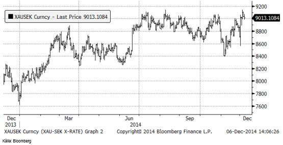 Den svenska kronan är svag och har gått från 9.10 mot euron i början av september till 9.28 i fredags. Det innebär att guldpriset faktiskt stod på årshögsta i veckan som gick, även om en viss rekyl noterades i torsdags och fredags.