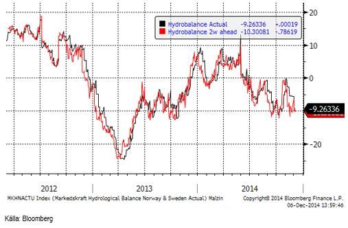 Hydrologisk balans har enligt 2-veckors prognosen sjunkit från -7.7 TWh till -10.3 TWh.