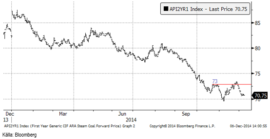 Nedan ser vi terminskontraktet för leverans av kol under 2015, som sjunkit från 72.10 dollar per ton till 70.75 i fredags.
