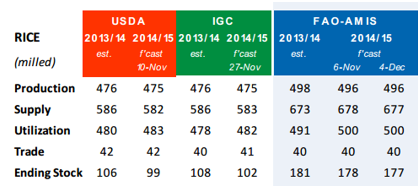 FAO / AMIS lämnade produktionsestimatet oförändrat i rapporten som kom den 4 december. Utgående lager sänks med 1 mt till 177 mt.