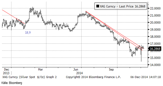 Silverpriset står och väger. Tekniskt har motstånden brutits, oavsett hur man drar linjen, men det finns inget momentum uppåt i prisrörelsen, så detta behöver inte betyda att den fallande trenden är bruten.