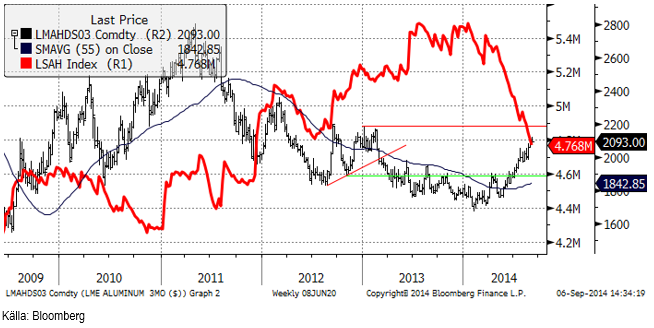 Som väntat gav uppgången en anledning för aktörer att öka på sina köpta positioner. Det första motståndet uppnåddes nästan. Det klassiska mönstret med ett nytt test av motståndsnivån och ett brott av det mot högre prisnivåer är vad vi kan vänta oss härnäst. Fundamentalt finns inte så mycket att rapportera. Enligt Metal Bulletin ger inte premierna för fysisk metall någon vägledning åt något håll, men om något, så är det i så fall en lite svagare utveckling både i Europa och i Asien.