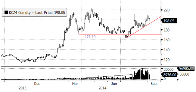 Det är inga större nyheter på kaffefronten. Tekniskt ser vi att priset på decemberkontraktet tagit sig upp till 200 cent. Möjligen kommer priset att gå upp till 220 cent, där ett starkt motstånd finns. Fundamentalt ser vi dock inte något som talar för högre pris på kaffe.