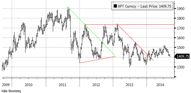 Platinapriset föll ner till 1400 dollar, som är en teknisk stödnivå.