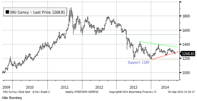 Nedan ser vi veckochartet för guld i dollartermer. Det har faktiskt utlöst ett brott av triangelformationen – på nedsidan. Det brukar anses vara en stark teknisk säljsignal. Allt fundamentalt till trots, vill marknaden inte ha guld just nu.
