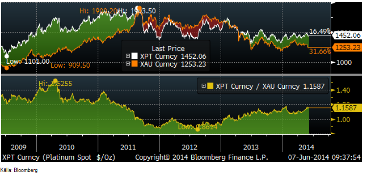 I diagrammet nedan ser vi hur platinapriset utvecklat sig i förhållande till guldpriset. Sedan 2012 har platina varit en bättre placering än guld.