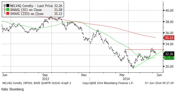 Fjärde kvartalets eltermin får vi studera nu, när certifikatens underliggande terminskontrakt är rullat in i den. Nedan ser vi ett kursdiagram. Brottet uppåt följdes inte av en ny trend uppåt, utan var en ur teknisk synvinkel så kallat falskt utbrott. Besvikelsen över sådana brukar kunna leda till en (över) reaktion åt andra hållet, i det här fallet nedåt. Vi har sett marknaden sjunka förra veckan och stöd finns precis under. Skulle detta brytas, kan vi nog få en lite längre nedgång kanske mot 31 euro från 32.26 i fredags.