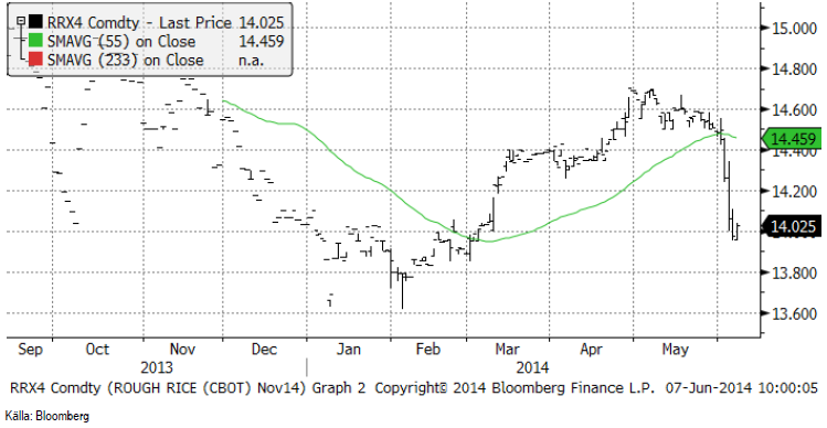 Priset på ris (novemberkontraktet på CME) inledde juni månad med ett kraftigt prisfall från 14.50 till 14 cent per pund. Bakom ligger statistik om hög produktion både i Thailand och att USA:s ris är i utmärkt kondition.