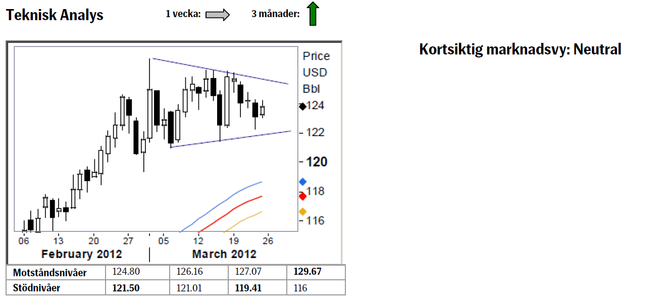 - Teknisk Analys: Vår vy är sedan förra veckan helt oförändrad och kommer att så förbli tills antingen vi bryter upp ur triangeln bekräftandes vår vy om en ny topp i 129-131-området alternativt bryter ned under 121,50, vilket skulle göra triangeln obsolet och då snarare peka på en toppformation (såsom det ju eventuellt ser ut att bli i fallet koppar).Teknisk Analys: I och med brottet över aprilkontraktets tidigare topp förstärks uppåt potentialen. Nästa givna mål ska sökas vid 129.75/131.39 området, nästa Fibonacci projektionsområde. Där ovanför återfinns också toppen från 2007, 147.50. Det är dock noterbart att i €uro termer så handlas Brentoljan nu på nya rekordnivåer.