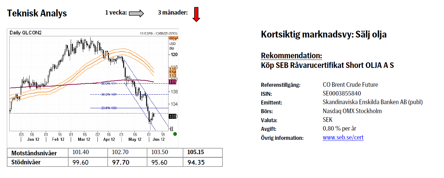 Teknisk analys: Korrektiv rörelse högre att vänta Även ett fritt fall tar någon gång slut. Den kortsiktigt överdrivna rörelsen ner mot $95.60 i måndags korrigeras nu och detta kan fortsätta upp mot första korrektionsmålet (23.6%) vid $102.70, möjligen också mot den fallande motståndslinjen, nu vid $103.50, eller t.o.m. mot gamla stödet vid $105.15. Tillbaka under $97.70 skulle omintetgöra möjligheterna till vidare uppgång i ett kortsiktigt perspektiv, utan i stället ställa om siktet mot höstens botten vid $94.35.