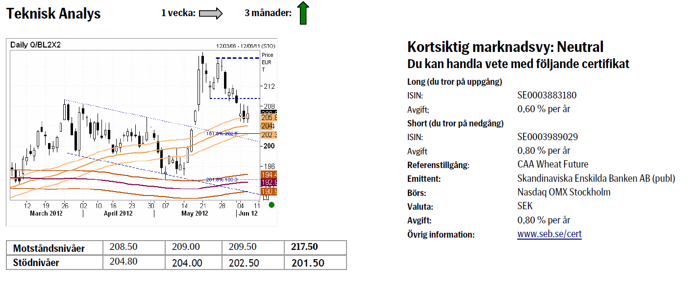 Crop condition för vintervetet i USA, som rapporterades i måndagskväll ligger nu på 52 procent good/excellent och det är TVÅ procent lägre än förra veckan. Nivån är emellertid bra och jämfört med förra året är den t.o.m. mycket bra. Skörden av vintervete i USA går betydligt fortare fram än vanligt. Utsikterna för veteskörden ser fortsatt bra ut och vi behåller vår neurala syn.