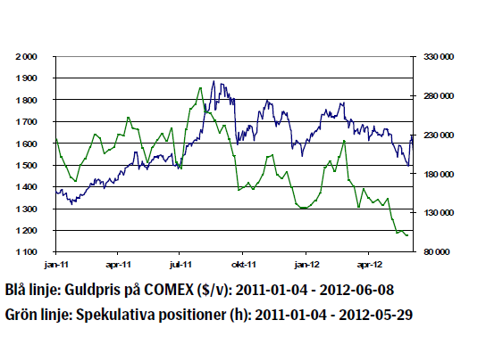 En ökad penningmängd driver på guldpriset men även andra ”risky assets” såsom råvaror generellt och aktier. Idag faller guldet p.g.a. bristen på antydningar om kvantitativa lättnader och vi fortsätter ha en försiktig hållning till guldet efter den snabba rekylen efter förra veckans rally.