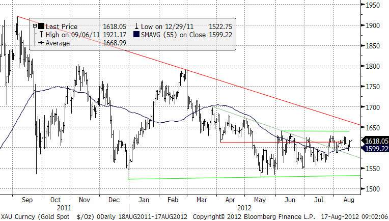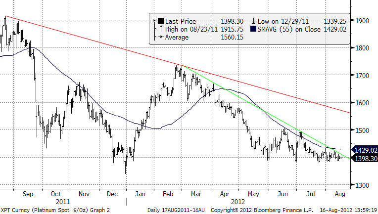 Koppar handlas i ett brett prisintervall; $7600-$7300. Känslan är att den kinesiska ekonomin behöver en stimulans. Priset vill inte riktigt bryta på nedsidan. Risken är för stor, när Kina väl gör något tar det fart uppåt. Vi nämnde i förra veckans brev vikten av att hålla ett extra öga på kopparimporten. Fredagens handelssiffror visade en månadsimport om 366 tton, 5.6 % högre jämfört med juni och + 19,5 % år från år. Den totala importen i år är 2,8 milj ton, hela 43 % högre jämfört med 2011. Som vi tidigare nämnt är kopparmarknaden fortsatt stram med ett utbudsunderskott i storleksordningen 300 tton i en marknad som producerar ca 20 milj ton globalt. Koppar är en köpvärd metall. Det är mycket en fråga om timing (som alltid!). Det säsongsmässigt svaga 3:e kvartalet i kombination med oron för tillståndet i den Kinesiska ekonomin dämpar just nu. 3-månaderspriset på LME handlas i skrivandes stund i $ 7414/ton. Första stödet kommer in mellan $7300 och $7350. Bryter den nivån finns risk för en prisnedgång mot $7000 (motsvarande $3,18/lbs för Comex-kontraktet), ca 5 % under dagens nivå.