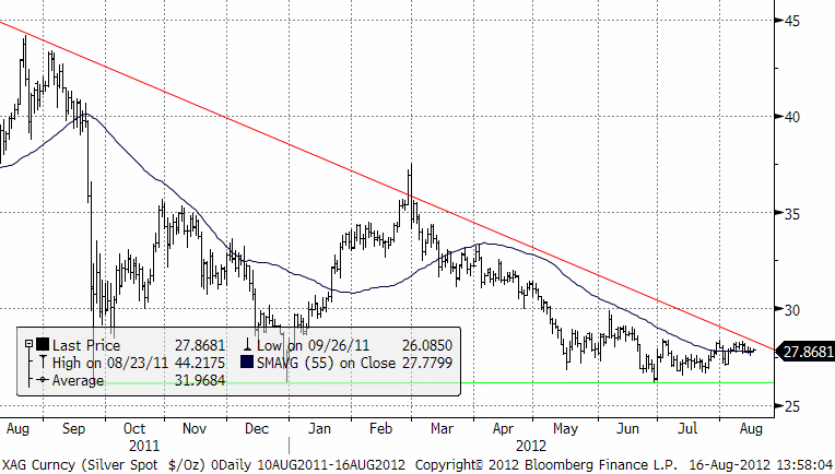 Silver ser ut att ha etablerat en botten på 26 dollar och ser ut att konsolidera sig inför en eventuell förestående prisuppgång. Om / när trendlinjen i diagrammet nedan bryts signalerar det att nedåttrenden är bruten . Nästa motstånd är 30 dollar. När den bryts erhålls en köpsignal. Vi tycker att man ska undvika att vara kort silver, utan istället försöka komma in på den långa sidan, men man ska inte göra det förrän trendlinjen bryts! Ibland händer det, ganska ofta faktiskt, att trendlinjen håller. Den senaste veckans kursrörelser har varit så kraftlös att det är lite för hög risk att äga silver på kort sikt. Vi tycker att man ska kliva ur eventuella långa positioner och vänta och se vad som händer.