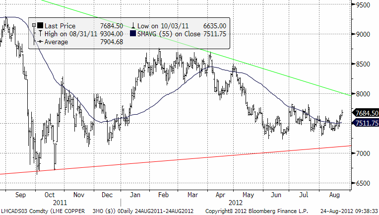 Man anger låga råvarupriser som huvudsakligt skäl. En förklaring till den svaga tendensen under sommaren har just varit oron för ett ökat utbud. Vi utryckte vår bedömning förra veckan att priserna ligger i startgroparna inför det säsongsmässigt starkare fjärde kvartalet. Frågan är om det vi nu ser är en tjuvstart? Det mesta talar för en början till vändning, men risken är stor att priserna (vid någon besvikelse över någon makrodata) faller tillbaka igen. Tekniskt sett har trenderna definitivt vänt från neråtgående till mer sidledes. Det behövs mer tid för kraftansamling. Koppar visade vid sidan av nickel störst styrka under veckan. Det är för tidigt att tala om en vändning uppåt. Tekniska analytiker bevakar 100dagarssnittet som kommer in på $7724. Dagens högsta nivå är 7720 ! Marknaden står och väger och frågan är om den har kraft nog att bryta uppåt i nuläget. Oron kvarstår för Kina. Helgens nyhet att fastighetspriserna steg i 49 av 70 större städer som regeringen följer i juli jämfört med juni, minskar sannolikheten för ett snart stimulanspaket i Kina. Det finns således anledning att vila lite på hanen. För den tradingbenägne kan det dock erbjudas intressanta möjligheter i intervallet: 7300-7400 på nedsidan och 7600-7700 på uppsidan.