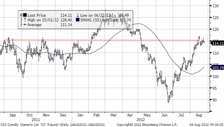 Oljan närmar sig slutet av den här uppgångsfasen. Det är en ”tight” balans mellan tillgång och efterfrågan på råolja i Atlanten. Detta återspeglas i ”backwardation” i terminskurvan. Nedan ser vi kursdiagrammet på spotkontraktet på Brent på ICE.