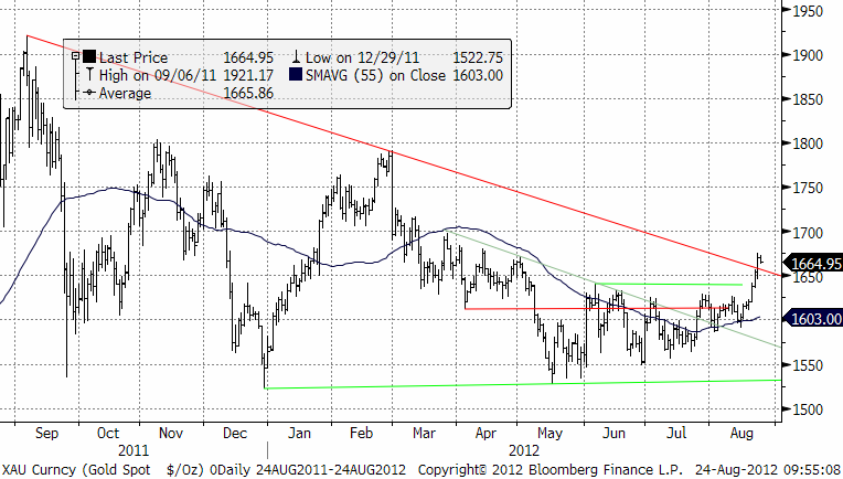 Vår favorit bland ädelmetallerna, platina har utvecklat sig väl. De som följt vårt råd borde vara glada därför att PLATINA S har gått upp med drygt 7% sedan förra veckobrevet. Det börjar pratas om ett nytt QE3. I FOMC-protokollet sägs detta rätt så tydligt. Så här skrev man: MORE STIMULUS SHOULD BE LAUNCHED IF A ”SUBSTANTIAL AND SUSTAINABLE” IMPROVEMENT IN THE RECOVERY IS NOT SEEN ”FAIRLY SOON”. Det talar för ädelmetaller. Vi tycker att man ska äga PLATINA S, GULD S och SILVER S. Möjligen kan man ta hem vinster på PLATINA S nu och byta till GULD S. Vi ser i diagrammet nedan, att guldpriset i dollar har brutit motståndslinjen, vilket är en teknisk köpsignal.