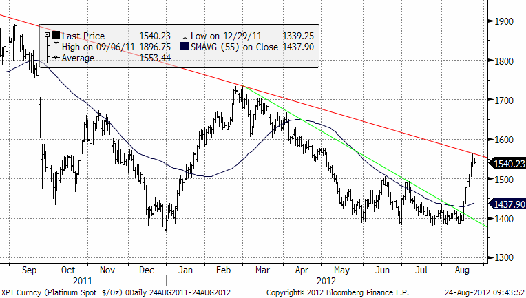 Sedan oroligheterna vid Lonmin’s Marikana-gruva i Sydafrika eskalerade i förra veckan har priset stiga ca 10 %., från ca $1400/oz till dagens notering på $1547. Lonmin har finansiella problem vilket förvärrar situationen. Företaget producerar 750 000 oz, ca 16 % av Sydafrikas totala utbud som i sin tur utgör hela 75 % av det globala utbudet (ca 6,4 Milj oz). Risken finns att konflikten sprider sig till andra gruvor i landet. Den senaste strejken vid Impalas gruvor i januari varade i 6 veckor och orsakades av samma orsaker, vilket inkluderar en maktkamp mellan olika fackföreningar. För att ytterligare störa situationen gav Sydafrikas president, Jacob Zuma, gruvarbetarna sitt stöd. Han hotade med att ta Lonmins gruvlicens om bolaget inte gav gruvarbetarna 40% mer i lön, som är vad de kräver. Lonmin tjänar inga pengar, utan redovisade en förlust det första halvåret i år. Det är alltså en ohållbar situation och det torde innebära att priset på platina, allt annat lika, kommer att gå upp. Förutom utbudsrisken får Platina stöd i sig egenskap av ädelmetall, och hänger på guldprisets uppåt (där förhoppningar om ett amerikanskt stimulanspaket är huvudförklaringen). Platina klassas som ädelmetall, men sett till konsumtionen är den en industrimetall. Bilindustrin är den största konsumenten där metallen är en viktig beståndsdel i katalysatorer, vars tillverkning står för ca 35 % av den totala efterfrågan. Med vår syn på basmetaller och guld kombinerat talar det mesta för en fortsatt stark prisbild på sikt. Kortsiktigt finns dock risk för rekyl då uppgången gått lite väl fort i samband med oroligheterna i Sydafrika.