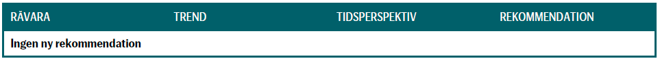 Råvaror: Oljeprisuppgången har stagnerat de senaste veckorna och tecken av svaghet kan skönjas, tycker vi. LME’s basmetallindex har än så länge klarat sig ifrån att falla igenom den kritiska stödnivån vid 2205. Zink och koppar uppvisar tecken på att åter stiga något i pris. Vårt antagande att sockerunderskottet skulle ha varit mer eller mindre i priset visade sig vara fel och vi har också stoppat ut positionen. Majs börjar nu närma sig en första mål nivå, 421/424, varför vi siktar på att ta vinst vid 420.