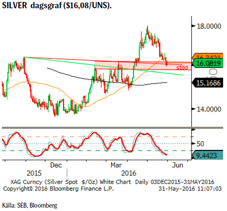 Den korrektion vi sökt under de senaste veckorna har nu materialiserats i och med att kursen nu fallit ned till det första huvudstödsområdet, $1208 – 1191. Vi söker nu med ljus och lykta efter positiva tecken som kan bekräfta en avklarad korrektion. En stark arbetsmarknadsstatistik från USA på fredag (efter förra fredagens hökaktiga tal från Yellen) får väl anses vara den enskilt största risken för guldpriset. Även om en junihöjning från Fed i sådana fall rycker närmare så bör vi ändå förvänta oss att Fed fortsätter att agera med försiktighet.