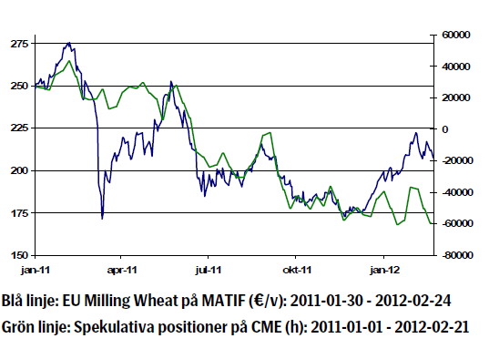 - Efter att ha stigit något den senaste månaden har nu andelen spekulativa köpare av vete i Chicago fallit ned mot tidigare bottennivåer igen. Vi väljer att hålla med spekulanterna i terminsmarknaden och ser negativt på priset kommande veckor.