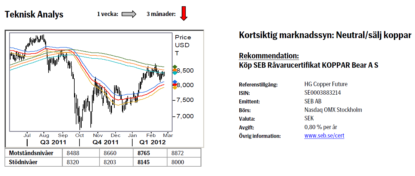 - Kortsiktigt tror vi att risken för ett högre pris dämpas av Greklandsuppgörelsen som fortsätter att oroa marknaden. Att Kinas premiärminister förväntas signalera ett tillväxtmål under 8 procent för 2012 på partikongressen den 5:e mars verkar också dämpande på kopparpriset.