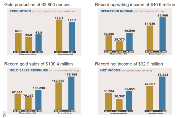 Semafo grundades 1995 och uppnådde under det första halvåret 2011 en guldproduktion på 128.800 troy ounce. Bolagets prognos är en produktion på mellan 238.000 och 263.000 troy ounce för helåret 2011. Produktionskostnaden, cash operating cost, väntas bli mellan 595 och 645 dollar per uns. Bolaget har som mål att fram till 2015 dubbla sin produktion till 500.000 troy ounce guld per år.