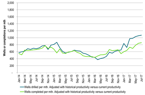 If completions catches up to current drilling then completions will run 40% higher than the previous peak in October 2014 in productivity adjusted terms.